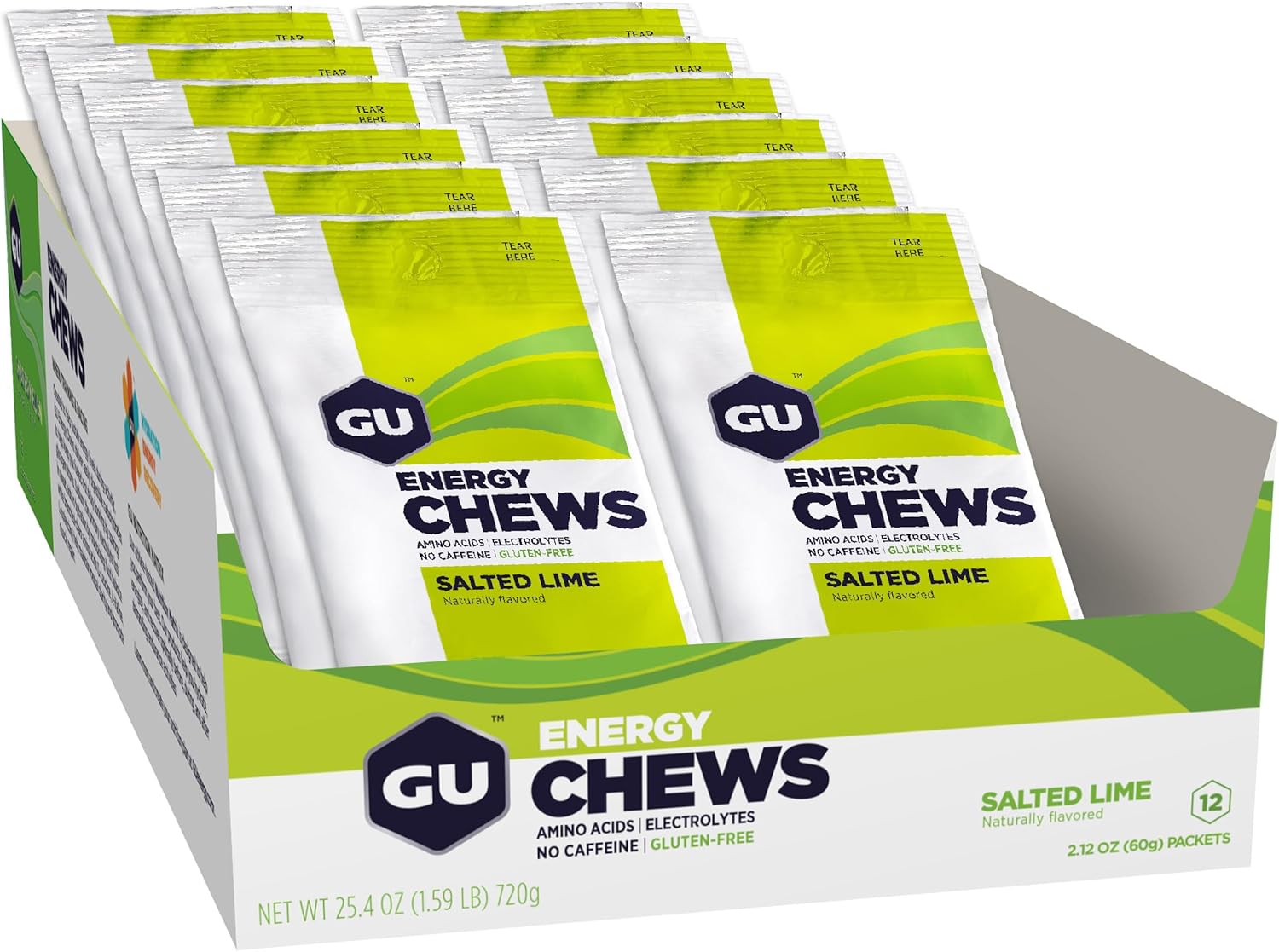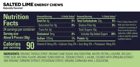 VARASTOERÄN PARASTA ENNEN PÄIVÄYS 29.10.2025 GU Energy Chews energiakarkit ovat pureksittava ja ruokaisampi vaihtoehto energiageeleille, kun kaipaat jotain pikku syötävää joka kuitenkin virkistää lähes yhtä nopeasti kuin energiageelit. Yhdessä pussissa on tupla-annospakkaus (yhteensä 16 karkkia) joka sisältää 2 kertaa 90 kcal annoksen hiilihydraattia ( 1 annos = 8 karkkia). Koostumus on mm. tärkeän aminhappokoostumuksen myötä aivan ylivoimainen ravintoarvoltaan muiden merkkien karkkien joukossa. GU energiakarkkien käyttöidea on vastaava kuin energiageeleillä ja myös tuotteen vaikuttavat aineosat ovat lähes samat. Usein vain kaipaa kovan suorituksen aikana syötävämpää tehotuotetta energiageelien ja urheilujuoman oheen. Salted lime energiakarkki on gluteeniton eikä sisällä kofeiinia.