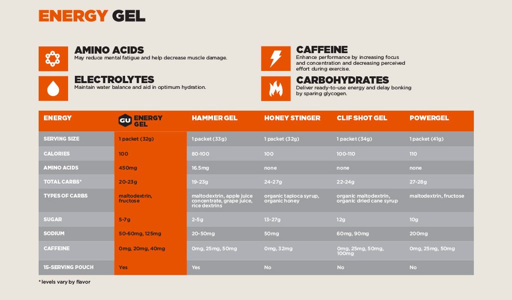 Lisäksi GU-aminohapposekoituksen (haaraketjuiset aminohapot), merisuolaa, kaliumia. Tässä erittäin hyvänmakuisessa geelissä on extrapitoisuus natriumia eli 125 mg (merisuolana!). Kofeiinia geelissä on 20 mg. Erittäin vatsaystävällinen.