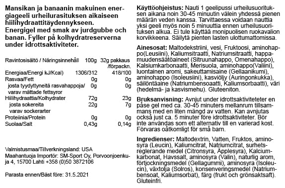 Energiageeli laadukkaalla ja vatsaystävällisellä energiasisällöllä (32 g / 100 kcal).