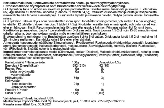 GU Hydration Drink Tabs urheilujuomapore sitruuna on vähäkalorinen, maistuva ja mineraalipitoinen juoma, jolla on helppo ja kätevä ylläpitää nestetasapainoa. Erityisen sopiva Hydration juoma on käytettäväksi muiden, energiaa sisältävien tehotuotteiden kanssa (energiageelit, energiapastillit, energiavohvelit).