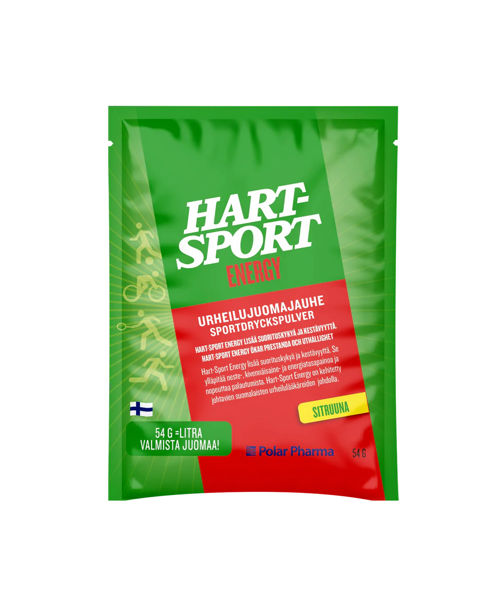 Lääkärien kehittämä: Luota suomalaisten urheilulääkäreiden asiantuntemukseen, jotka ovat huolella kehittäneet Hart-Sport urheilujuomajauheen täyttämään niin huippu-urheilijoiden kuin kuntoilijoidenkin tiukat vaatimukset. Yhdestä annospussista valmistat veteen sekoittamalla litran valmista urheilujuomaa. Ennen harjoittelua: Juo 1-2 dl Hart-Sport Energy -urheilujuomaa noin 20-30 minuuttia ennen harjoitusta ja myös juuri ennen harjoitusta täyttääksesi kehon energiavarastot. Harjoituksen aikana: Juo 1-2 dl Hart-Sport Energy -urheilujuomaa 15-20 minuutin välein.Juoman maku on lemon.